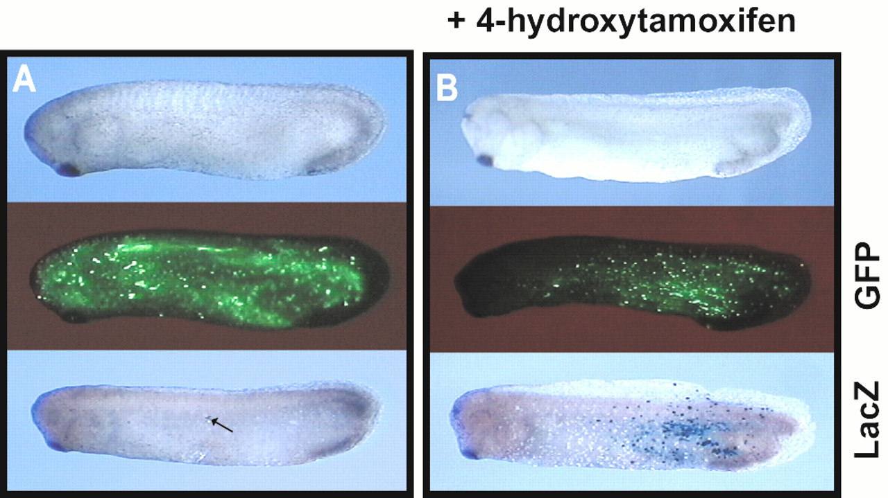 Figure 2. 4-Hydroxytamoxifen-regulated FLP activity in Xenopus embryos. (A and B) Stage 30 Xenopus larvae were derived from fertilized eggs coinjected with CMV:GFP(FRT)lacZ DNA and FLPER(T) mRNA. Embryos were cultured either in the absence (A) or in the presence of 4-hydroxytamoxifen (B). The living embryos were photographed in normal light (top) or in fluorescence light (middle). X-gal staining was obtained after fixation of the larvae (bottom).