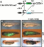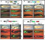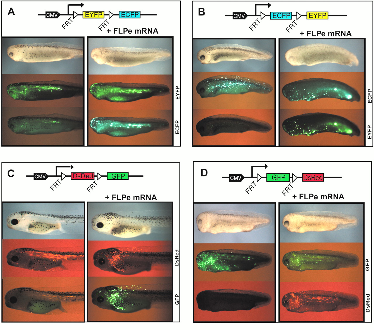 Figure 3. FLP reporters encoding different fluorescent proteins. The FLP inducible reporters CMV:EYFP(FRT)ECFP (A), CMV:ECFP(FRT)EYFP (B), CMV:DsRed(FRT)GFP (C) and CMV:GFP(FRT)DsRed (D) are schematically drawn in each panel. Xenopus larvae were derived from eggs injected with reporter DNA (left panels) or coinjected with reporter DNA and FLPe mRNA (right panels). The living larvae were photographed in normal light (top picture in each panel) or in fluorescence light using defined filter sets (middle and bottom picture in each panel). The excitation/barrier filters were 480/510 nm for EYFP and GFP, 425/475 nm for ECFP and 546/590 nm for DsRed.