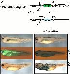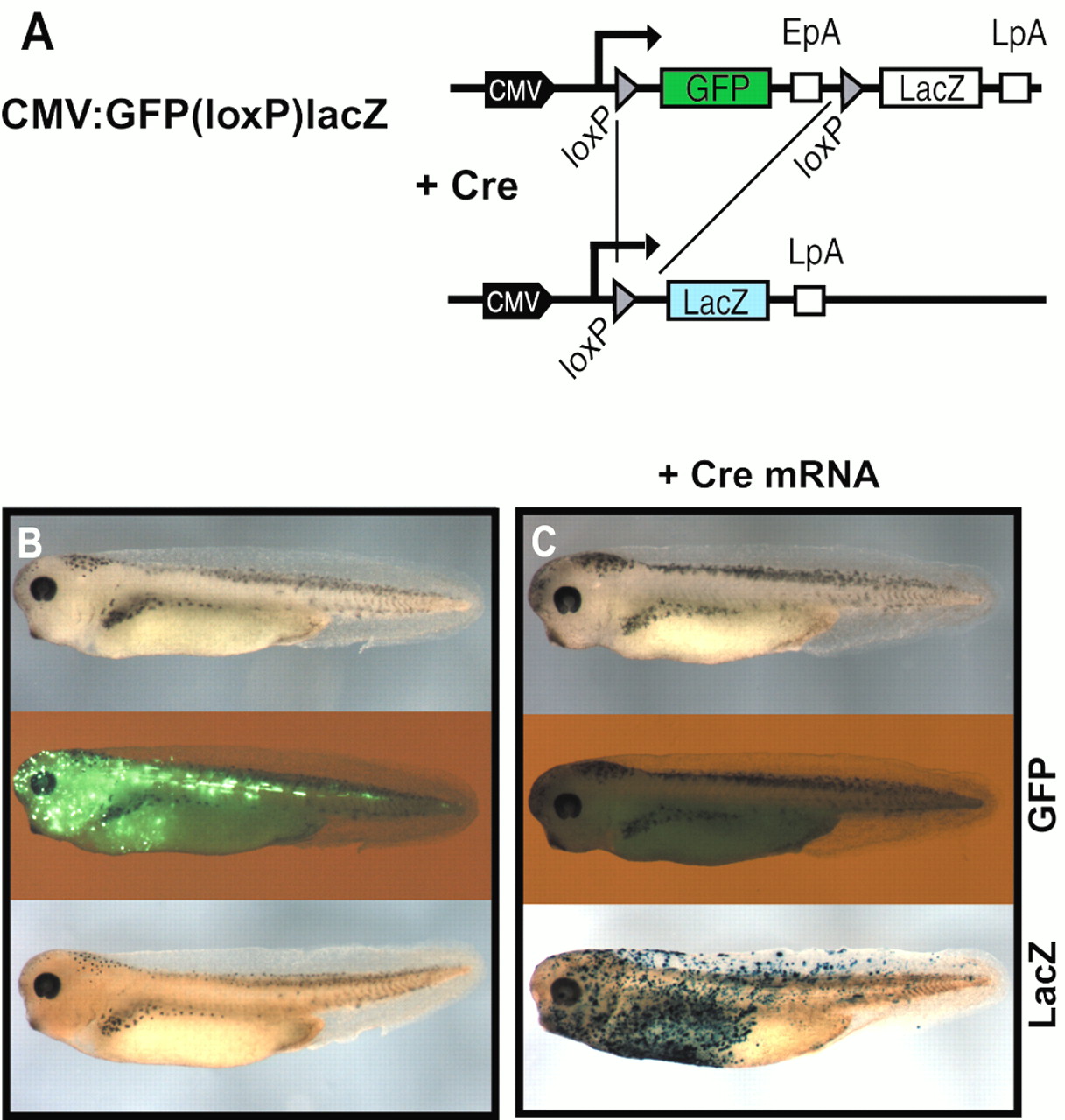Figure 4. Constitutive Cre activity in Xenopus embryos. (A) The Cre reporter construct CMV:GFP(loxP)lacZ is schematically drawn with the CMV promoter/enhancer driving the expression of the GFP and lacZ genes. The position of the SV40 EpA and LpA signals as well as the target sites of the Cre recombinase (loxP) are given. (B and C) Stage 38 Xenopus larvae were derived from eggs injected with CMV:GFP(loxP)lacZ DNA (B) or coinjected with CMV:GFP(loxP)lacZ DNA and Cre mRNA (C). The living animals were photographed in normal light (top) or in fluorescence light (middle). X-gal staining was obtained after fixation of the larvae (bottom).
