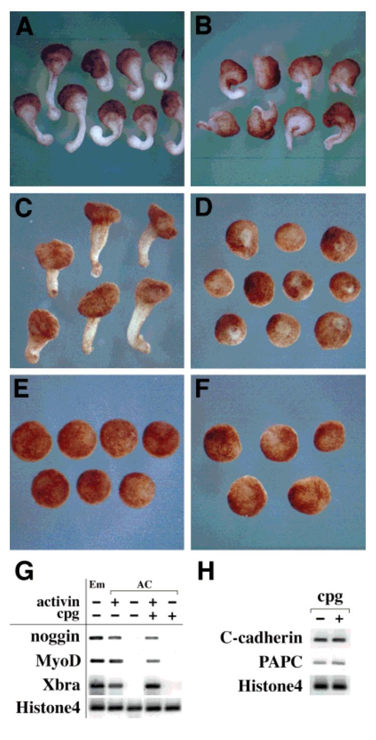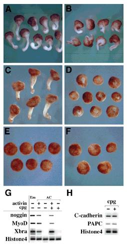 Fig. 6. cpg inhibited extension of Keller sandwich explants and the animal cap explants treated with activin. A: Keller sandwich explants from control embryos (four independent experiments, n 31). B: Keller sand- wich explants from cpg-injected embryos. cpg mRNA (1 ng) was injected into two lateral equatorial regions of the two-cell embryo. Dorsal sectors of cpg-injected embryos were excised at stage 10 and sandwiched. Overexpression of cpg caused a defect in the elongation (n 28). C: Animal cap explants from control embryos. The animal caps were ex- cised from stage 8 embryos and incubated for 6 hr with recombinant activin protein (10 ng/ml) and cultured in MSS until control embryos reached stage 20. A high dose of activin induced elongation of the animal cap (n 68). D: Animal cap explants from cpg-injected embryos. cpg mRNA (1 ng) was injected into the animal pole regions of both blas- tomeres at the two-cell stage, then explanted at stage 8, and treated with a high dose of activin (10 ng/ml) for 6 hr. cpg completely interfered with the elongation of the explants treated with a high dose of activin (n 73). E: Control animal cap explants without any treatment (n 63). F: cpg alone did not induce any morphologic changes and resulted in formation of spherical masses similar to those in E (n 25). G: RT-PCR of RNA extracted from the animal caps (stage 11) showed no significant effect of the overexpression of cpg on the expression of the mesodermal marker genes induced by activin (noggin, MyoD, and Xbra). H: cpg mRNA (1 ng) was injected into the lateral equatorial region of the two-cell embryo. RT-PCR showed no significant effect of overexpression of cpg on the expression of genes C-cadherin and PAPC, which are known to be related to the gastrulation movements.