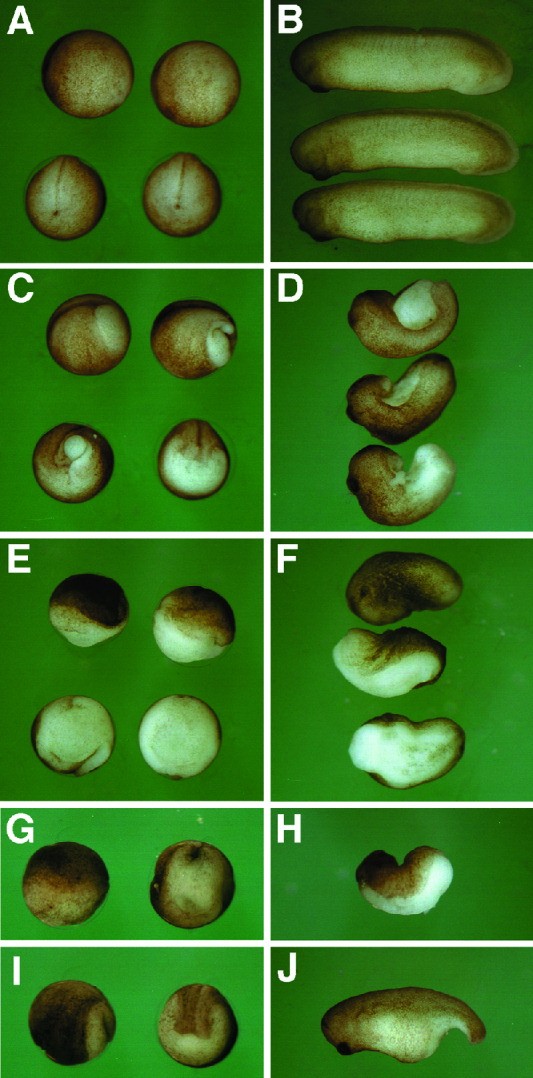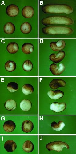 Figure 3. Overexpression of cpg interfered with gastrulation. A,C,E,G,I: Neurula stage embryos (st. 20). B,D,F,H,J: Tailbud stage embryos (st. 30). A,C,E: Upper, lateral view; anterior is to the left. Lower, blastopore view. G,I: Left, lateral view, anterior is to the left. Right, blastopore view. cpg mRNA (1 ng) was injected into the lateral equatorial regions of the two-cell embryo (C-F). cpg mRNA (1 ng) was injected into two dorsal (G,H) or two ventral (I,J) equatorial regions of the four-cell embryo. A,B: Control embryos. C,D: Embryos showing slightly defective phenotypes. Some of the injected embryos had a slightly opened blastopore in C and formed partial axial structures, including the head region in D. E,F: Embryos showing severely defective phenotypes. The blastopore of most of the injected embryos did not close but regressed during the neurula stage in E. The injected embryos elongated along the initial dorsoventral axis gradually during the tailbud stage and looked like flat layers of double sheets of the ectodermal and endodermal tissues in F. G,H: The morphology of the embryos that were injected into two dorsal regions at the four-cell stage was similar to that seen in E and F. I,J: Only ventral gastrulation was inhibited by overexpression of cpg in the ventral region.