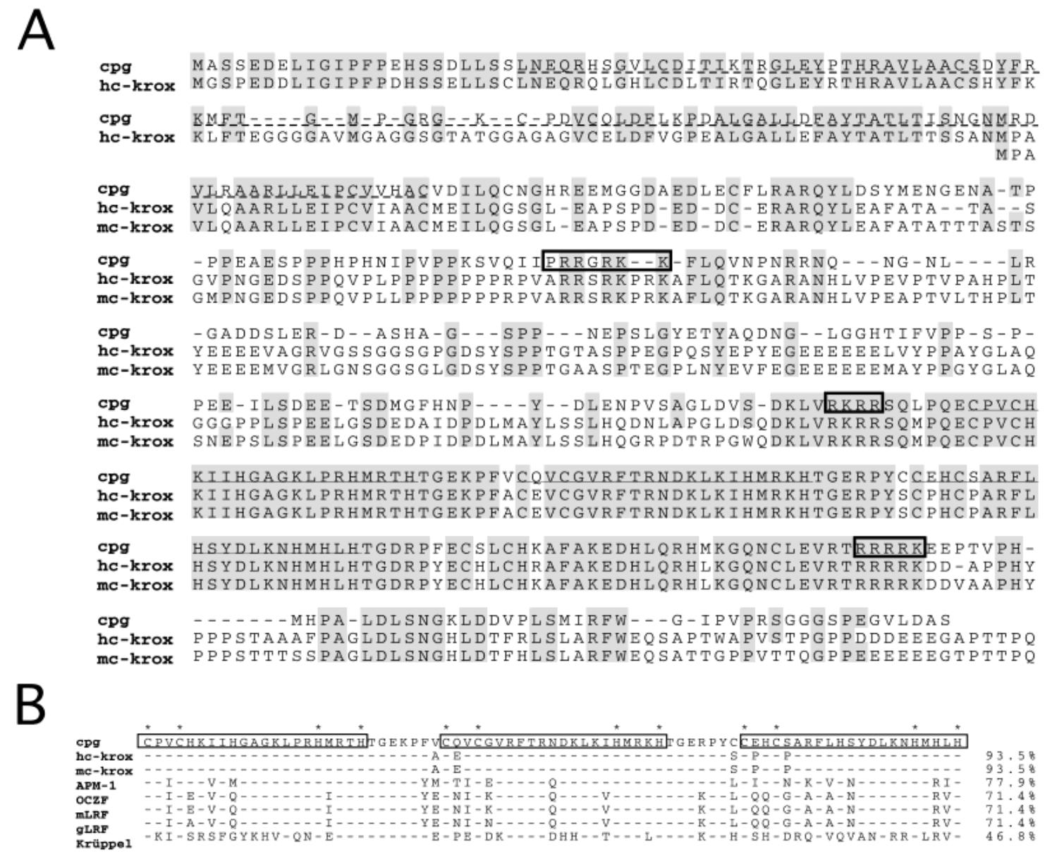 Fig. 1. A: Alignment of the cpg, human c-krox, and mouse c-krox amino acid sequences. The amino acid residues that are identical between the proteins are shaded gray. The putative nuclear localization signals identified by using PSORT are boxed. The POZ domain at the N-terminus is indicated by an interrupted underline. The zinc finger domains at the C-terminus are underlined. B: Homology of the zinc finger domains of cpg to those of other kru ̈ ppel-like zinc finger proteins. The zinc finger domains are boxed. Asterisks indicate the cysteines and histidines of the zinc fingers.
