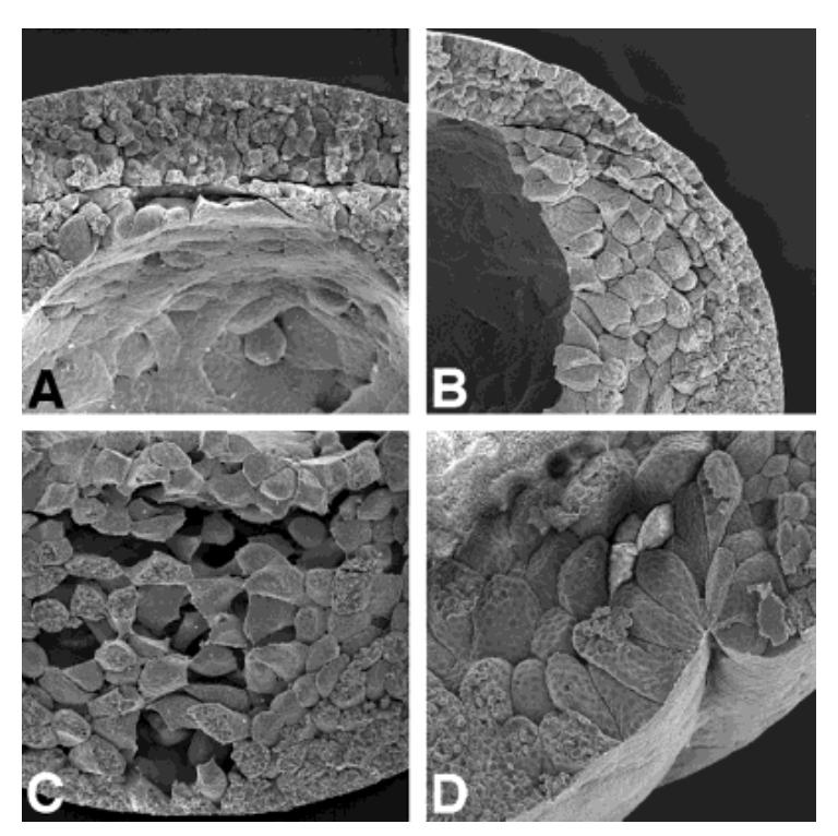 Fig. 5. Scanning electron microscopic images of cpg-injected em- bryos. cpg mRNA (1 ng) was injected into two lateral equatorial regions of the two-cell embryo, which was then fixed at the mid-gastrula stage (stage 11.5). A: Epiboly of the animal cap was inhibited, and the ecto- dermal layer of the animal pole was thick. B: The ectodermal layer of the lateral region became thin after lined with the yolky endodermal cells. C: Endodermal cells were scattered and did not closely adhere to each other. D: Normal-shaped bottle cells were formed.