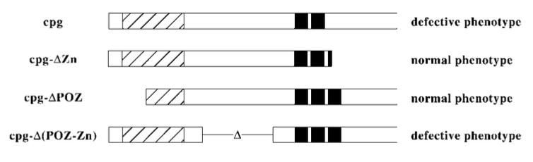 Fig. 7. Both the POZ and zinc finger domains of cpg were necessary to function as a transcription factor. cpg- POZ (four independent experiments, n 80) and cpg- Zn (n 80), which lack a part of the POZ domain and zinc finger domain, respectively, did not interfere with gastrulation. cpg- (POZ-Zn) interfered with gastrulation and the phe- notype of cpg- (POZ-Zn)-injected embryos (n 80) was similar to that of cpg-injected embryos (n 80).