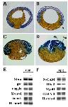 Fig. 4. Midsagittal sections (A-D) and revers transcriptase chain reaction (RT-PCR) (E,F) of the control and cpg-injected em- bryos. cpg mRNA (1 ng) was injected into two lateral equatorial regions of the two-cell embryo. A: The control embryo (stage 11.5). B: A cpg- injected embryo at stage 11.5. Initial invagination occurred (arrowhead), but gastrulation did not proceed thereafter. Although cpg overexpression interfered with invagination, the yolky endodermal cells were displaced toward the animal pole region. The border between the ectodermal layer and inner cells was not clear. C: A cpg-injected embryo at stage 20 looks like a mushroom. The blastocoelic cavity has disappeared, and the three germ layers are clearly defined. D: A cpg-injected embryo at stage 30. Neural tube (Ne) and notochord (No) are shown apparently at the site where the blastopore first appeared. E,F: RT-PCR showed no significant effect of overexpression of cpg on the expression of the early mesoder- mal (Xbra, goosecoid, noggin, and Xwnt-8) and mesendodermal (siam- ois) marker genes at the gastrula stage (stage 11) in E, and the late neural (N-CAM and Otx-2) and mesodermal (MyoD and GATA-2) marker genes at the late neurula stage (stage 23) in F.