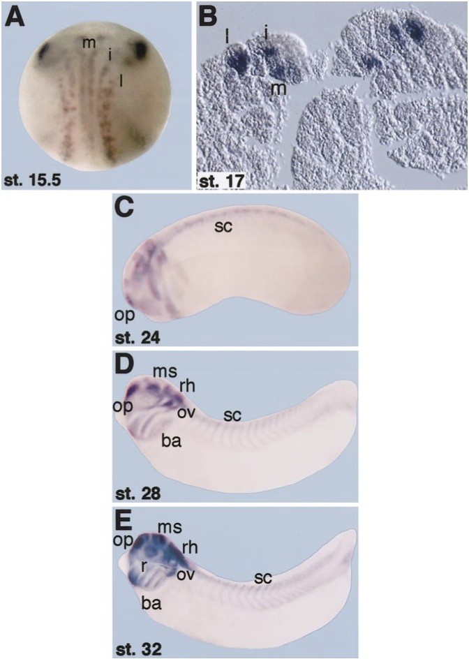 FIG. 2. Xebf3 is expressed in the developing Xenopus nervous system. Whole-mount in situ hybridization was performed on Xenopus embryos by using a digoxigenin-labeled Xebf3 probe. Shown are embryos at stages 15.5 (A), 17 (B), 24 (C), 28 (D), and 32 (E). Xebf3 was detected at early neural plate stage in the trigeminal placode (st. 13.5) and turned on in the three stripes of primary neurons at stage 15.5 (A: m, medial; i, intermediate; l, lateral). The embryo in (A) is oriented with anterior to the top. (B) Posterior transverse section of a stage 17 embryo, showing Xebf3 expression in the three stripes of primary neurons (m, i, l). At this stage, the neural plate is invaginating to form the neural tube. In tailbud stage embryos (C), Xebf3 was expressed in some branchial arches, olfactory placode, neural tube (mesencephalon, rhombencephalon, and spinal cord), retina, and otic vesicle. Embryos in (C) were cleared using a 2:1 mixture of benzyl benzoate/benzyl alcohol. Abbreviations: ba, branchial arches; ms, mesencephalon; op, olfactory placode; ov, otic vesicle; r, retina; rh, rhombencephalon; sc, spinal cord.