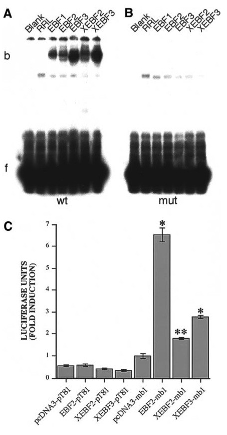 Fig.3. XEBF3 binds the EBF/OLF-1 binding site and can activate transcription in vitro. The DNA binding and transactivation activities of XEBF3 and XEBF2/XCOE2 were compared to the mouse EBF proteins. (A, B) Gel mobility shift assay showing specific affinity of the EBF/XEBF factors for the EBF/OLF-1 palindromic binding site. Blank, no lysate; RRL, rabbit reticulocyte lysate only; other lanes, in vitro-synthesized, unlabeled EBF/XEBF proteins. All of the reactions were incubated with [gamma-32P] end-labeled double-stranded oligonucleotide containing either a wild-type or mutated EBF/ OLF-1 binding site derived from the OMP (Olfactory Marker Protein) promoter and then run on a nondenaturating polyacrylamide gel. A shifted band was observed after the incubation of all of the EBF/XEBF proteins with the wild-type binding site (A), but not with a mutated site (B). (b) Indicates the shifted bands and (f) the free probe. (C) Luciferase assay revealing the different levels of transactivation activity of the EBF family members. Luciferase activity was measured in luciferase units and was assayed from lysates of NIH3T3 cells. The cells were transfected with 5 ug of either the pcDNA3 expression plasmid or pcDNA3 containing coding sequence for the following EBF factors: mouse EBF2, XEBF2, XEBF3. A total of 10 ug of the luciferase reporter plasmid pT81 either containing (mb1) or lacking (pT81) the mb1 promoter sequence was cotransfected into the cells to monitor transactiva- tion activity of the expressed proteins. In all of the samples, 300 ng of pRL-TK was transfected as an internal control. The graph is labeled so that, for each bar, the expression plasmid is listed first and the reporter plasmid is listed last (e.g., EBF2-mb1). Values indicate the mean of the results from three independent experiments and all of the columns indicated by an asterisk (*) are statistically different from control luciferase values (*, P < 0.0002; **, P < 0.001 by Student t-test).