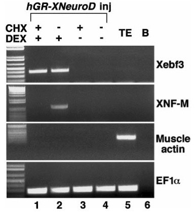 FIG. 6. Xebf3 expression in animal caps can be activated by hGR-XNeuroD in the absence of protein synthesis. RT-PCR on animal caps isolated from hGR-XNeuroD-injected embryos, treated with or without dexamethasone (DEX) and/or cyclohexi- mide (CHX), an inhibitor of protein synthesis. Hormone-dependent activation of injected hGR-XNeuroD promoted ectopic expression of Xebf3, both in the absence and presence of protein synthesis (lanes 1 and 2), while activation of XNF-M expression was only observed in the presence (lane 2) but not the absence of protein synthesis (lane 1). Xebf3 and XNF-M expression were not induced in the absence of dexamethasone (lanes 3 and 4). TE (lane 5) indicates total embryo at stage 14, and B (lane 6) is a blank in which template was excluded from the PCR. Muscle actin is a mesoder- mal marker, and EF1-alpha was used as a loading control.