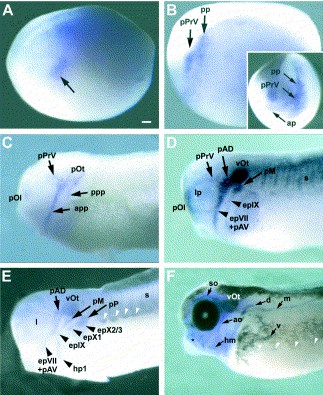 Fig. 3. Spatiotemporal expression of XEya1 during Xenopus development (lateral views). (A) At neural plate stages (stage 14), an ectodermal domain (arrow) lateral to the neural folds expresses XEya1. (B) At neural fold stages (stage 18; insert, same specimen in oblique anterior view) this domain has separated into a profundal/trigeminal placodal area (pPrV) and a posterior placodal area (pp). The latter corresponds to the âdorsolateral placodal areaâ of Schlosser and Northcutt (2000), but has been assigned a more neutral label here, because XEya1 expression suggests that it may be the precursor not only of lateral line and otic placodes but also of epibranchial placodes. XEya1 also starts to be expressed in the anterior placodal area (ap) of the anterior neural folds, the precursor of adenohypophysis and olfactory placodes. (C) At early tailbud stages (stage 22), XEya1 expression is maintained in the olfactory placodes (pOl), the developing adenohypophysis (data not shown), and the profundal/trigeminal placodal area. Within the posterior placodal area of XEya1 expression, it is now possible to distinguish the otic placode (pOt) and two ventral extensions. The anterior extension (app) is closely apposed to the profundal/trigeminal placodal area. It will give rise to the anterodorsal and anteroventral lateral line placodes and the facial epibranchial placode. The posterior extension (ppp) will broaden later and give rise to the remaining lateral line, epibranchial and hypobranchial placodes. (D) At mid-tailbud stages (stage 26), XEya1 continues to be expressed in the shrinking profundal and trigeminal placodes (pPrV), in the otic vesicle (vOt), in the anterodorsal (pAD) and anteroventral (pAV) lateral line placode, as well as in the facial epibranchial placode (epVII). The apparently contiguous XEya1 expression domain anterior to the otic vesicle reflects the close apposition of these placodes (Schlosser and Northcutt, 2000). The middle (pM) lateral line placode and the developing glossopharyngeal (epIX) epibranchial placode but not the lens placode (lp) also express XEya1. Moreover, XEya1 transcripts are now detectable in the somites (s). (E) At stage 30, XEya1 is expressed in all neurogenic placodes, including the newly developed posteriorlateral line placode (pP), vagal epibranchial placodes (epX1 and epX2/3), and hypobranchial placodes (hp1), in the somites and in the hypaxial muscle precursors (white arrowheads), but not in the lens (l). (F) At early tadpole stages (stage 41), XEya1 expression persists in placodally-derived structures such as the otic vesicle (vOt) and in the primordia of lateral lines derived from the anterodorsal (e.g. supraorbital line, so), anteroventral (e.g. hyomandibular line, hm; other lines, asterisk), middle (e.g. aortic lateral line, ao), and posteriorlateral line placodes (dorsal, middle and ventraltrunk lines, d, m, v). The XEya1 positive hypaxial muscle precursors (white arrowheads) have migrated further ventrally. Bar in (A): 0.1 mm (AâF).