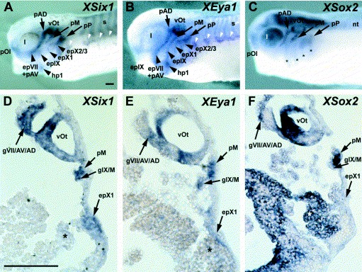 Fig. 4. Expression of XEya1 (B,E) compared to other placodal markers XSix1 (A,D) and XSox2 (C,F) in lateral views (AâC) and transverse sections at the level of the otic vesicle (DâF) of stage 30â34 Xenopus embryos. Patterns of expression of XEya1 (B,E) and XSix1 (A,D) are largely identical in the adenohypophysis (data not shown), olfactory placodes (pOl), the otic vesicle(vOt), lateral line placodes (pAV, pAD, pM, pP), epibranchial (epVII, epIX, epX1, epX2/3) and hypobranchial placodes (hp1). Co-expression of both genes is also observed in cranial ganglia that have a placodally-derived component, e.g. in the profundal/trigeminal ganglionic complex (data not shown), in the fused ganglia of the facial, anteroventral and anterodorsal lateral line nerves (gVII/AV/AD in D,E), and in the fused ganglia of the glossopharyngeal and middle lateral line nerves (gIX/M in D,E). Additionally, XEya1 and XSix1 are co-expressed in the somites (s in A,B), in hypaxial muscle precursors (white arrowheads in A,B) and weakly in the pharyngeal pouches (asterisks in D,E). Placodal expression of XSox2 (C,F) overlaps with the expression of XEya1 and XSix1 in the adenohypophysis (data not shown), the olfactory placode, the otic vesicle and the lateral line placodes, as well as in some cranial ganglia (e.g. gVII/AV/AD in F). In contrast to XEya1 and XSix1, however, XSox2 is not expressed in the profundal/trigeminal placodes or ganglia (data not shown) and in the epibranchial placodes (C), whereas it is strongly expressed in the neural tube (nt), the lens (l), and the pharyngeal pouches (asterisks). Bar in (A): 0.1 mm (AâC). Bar in (D): 0.1 mm (DâF).