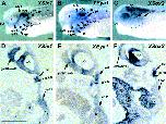 We cloned two isoforms of the Xenopus Eya1 orthologue. They show identical patterns of expression that closely resemble the previously described expression of XSix1, but partly differ from the expression of Eya1 in other vertebrates. XEya1 is expressed in the somites and hypaxial muscle precursors, but not in the pronephros. Moreover, all ectodermal placodes except the lens placode strongly express XEya1. At neural plate stages, ectodermal XEya1 expression starts in two domains, the anterior neural folds and a domain lateral to the neural folds. At tailbud stages, XEya1 expression continues in the adenohypophysis, all neurogenic placodes and placodally-derived structures including cranial ganglia, the otic vesicle and lateral line primordia.
