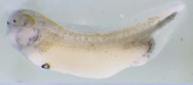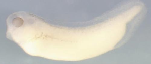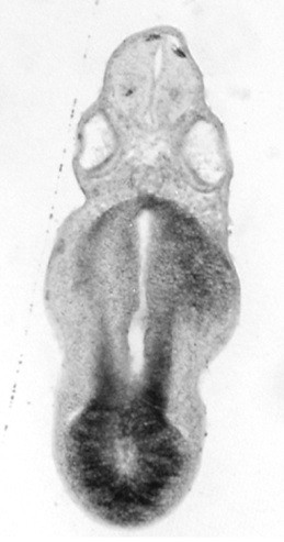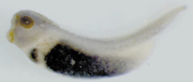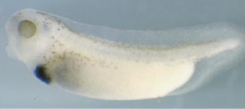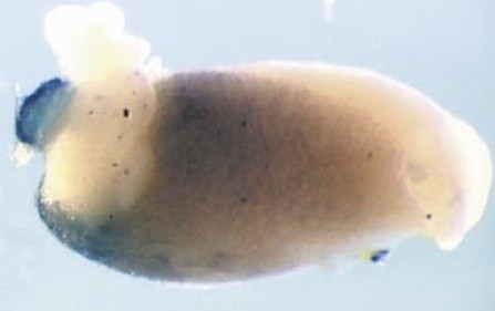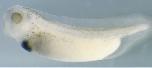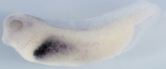 tf (transferrin) gene expression in Xenopus laevis embryo, visualised via light blue 5-bromo-4-chloro-3- indolyl-phosphate color reactions, in NF stage 46/47 isolated gut tubes, anterior left. |