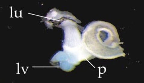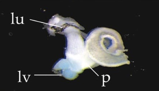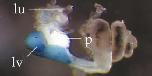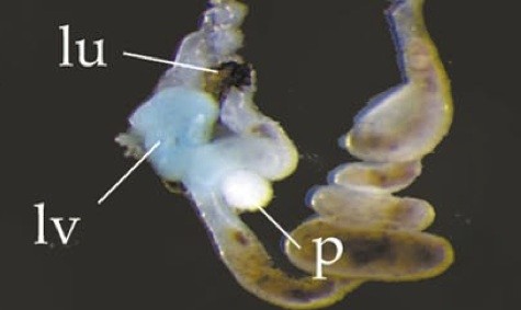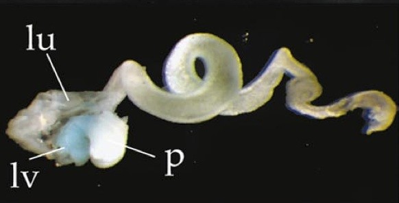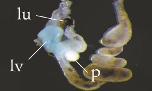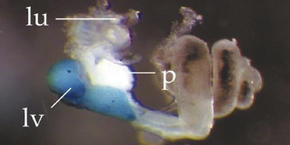alb (albumin) gene expression in Xenopus laevis embryo, visualised via light blue 5-bromo-4-chloro-3- indolyl-phosphate color reactions, in NF stage 46/47 isolated gut tubes, anterior left. |