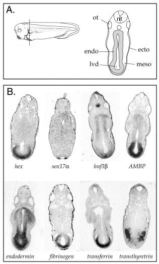 Fig. 3. Expression of markers in the liver diverticulum endoderm. (A) Schematic of a tail bud embryo (stage 33) with the line indicating the plane of section through the liver diverticulum (left). The right side shows a typical resulting section with the endoderm indicated in grey. ot, otic vesicle; nt, neural tube; endo, endoderm; ecto, ectoderm; meso, mesoderm; lvd, liver diverticulum. (B) Representative vibritome sections (as illustrated above) of whole-mount embryos hybridized with the indicated probes. Sections from the hex, hnf3β, AMBP, endodermin, fibrinogen and transferrin stained embryos are through the anterior portion of the liver diverticulum at the level of the otic vesicle. Sox17α and transthyretin sections are from the posterior end of the liver diverticulum. All of the markers are expressed in the endodermal layer and excluded from the mesoderm. Note that the dark colour of the outer ectoderm is pigment and not staining. |