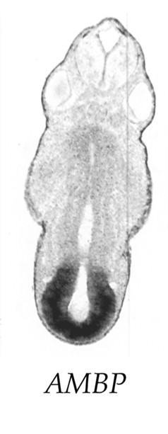 a2m (alpha-2-macroglobulin) gene expression in Xenopus laevis embryo, visualised via light blue 5-bromo-4-chloro-3- indolyl-phosphate color reactions, in NF stage 46/47 isolated gut tubes, anterior left. |