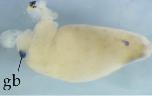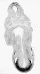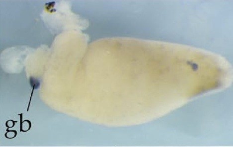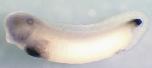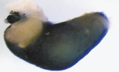 fgg (fibrinogen gamma chain) gene expression in Xenopus laevis embryo, liver visualised via light blue 5-bromo-4-chloro-3- indolyl-phosphate color reactions, in NF stage 46/47 isolated gut tubes, anterior left. |