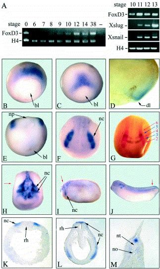 Fig. 2. Temporal and spatial expression of FoxD3 during Xenopus development. (A) Temporal expression was determined by RTâPCR using total RNA from embryos at different developmental stages (Nieuwkoop and Faber, 1967). A control reaction was performed in the absence of reverse transcriptase. Histone H4 was used as internal control. Right side: comparative RTâPCR for FoxD3, Xslug and Xsnail transcripts in RNAs of gastrula and early neurula stages. (BâJ) Spatial expression was analyzed by whole-mount in situ hybridization utilizing an antisense probe containing the complete coding region of FoxD3. Expression starts at stage 10.5 (B), is restricted at stage 11.5 to the dorsal lip (C) and is only visible in a superficial, but not the outer epithelial cell layer, as illustrated by a benzylbenzoate-treated embryo at stage 10.5 (D). During the beginning of neurulation, expression in the blastoporus region has disappeared, whereas on the lateral borders of the neural plate the prospective neural crest starts to express FoxD3 (E,F). An anterior view of a stage 16 embryo (G) which was double-stained with Krox20 (blue) and FoxD3 (red) shows expression in neural crest cells derived from rhombomeres 2, 4 and 6 (numbers mark the rhombomeres). Stage 18 embryo (H) at the onset of migration of cephalic neural crest. At stage 21, FoxD3 is predominantly expressed in migrating neural crest cells populating the hyoid arch (I). At stage 30 (J), expression is restricted to cephalic ganglia and crest cells at the posteriortrunk. (KâM) Transverse sections (50 μm) of embryos shown in H, I, and J, respectively; red arrows denote sectioning planes. bl, blastoporus; dl, dorsal lip; nc, neural crest; no, notochord; np, neural plate; nt, neural tube; rh, rhombencephalon.