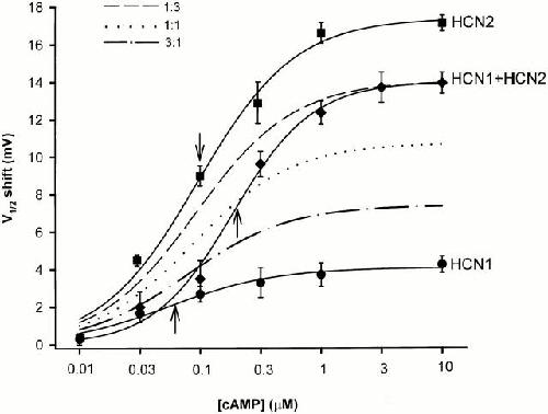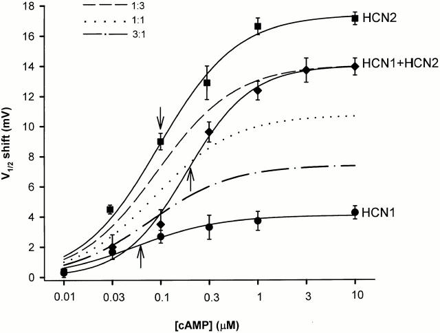 Figure 6. Coexpression of HCN1 and HCN2 generates channels with a novel cAMP dose–response relation. Mean dose–response curves for shifts in V1/2 as a function of cAMP concentration for HCN1 (closed circles, 26 patches), HCN2 (closed squares, 16 patches), and coexpression of HCN1 and HCN2 (closed diamonds, 31 patches). Solid lines show fit of the Hill equation (see materials and methods). The positions of the K1/2 values are indicated by arrows. Dash, dotted, and dash-dotted lines: linear sums of HCN1 and HCN2 dose–response curves at 1:3, 1:1, 3:1 (HCN1/HCN2) ratios.