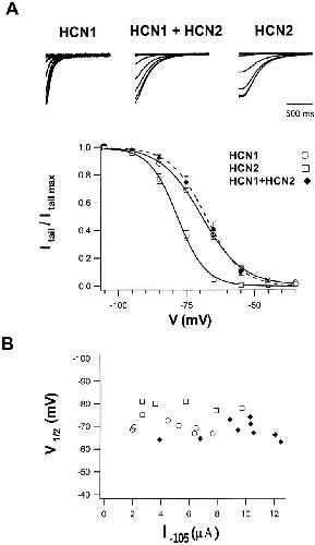 Figure 3. Steady-state activation curves for HCN1, HCN2, and coexpressed channels in intact oocytes. (A, top) Tail currents of either HCN1 alone, HCN2 alone, or coinjected HCN1 and HCN2. (bottom) Averaged, normalized steady-state tail current activation curves were obtained using 10-s hyperpolarizing steps for HCN1 currents (open circles, 8 cells) and currents produced by coexpression of HCN1 and HCN2 (closed diamonds, 9 cells); 30-s hyperpolarizing steps were used for HCN2 currents (open squares, 8 cells). Curves show fit of Boltzmann relations (see materials and methods for details). Bars show SEM. (B) Relation of steady-state V1/2 and Ih current amplitude at the end of 3-s hyperpolarizing step to −105 mV. Each symbol shows data recorded for an individual oocyte injected with HCN1 (open circles), HCN2 (open squares), or HCN1 + HCN2 (closed diamonds).