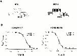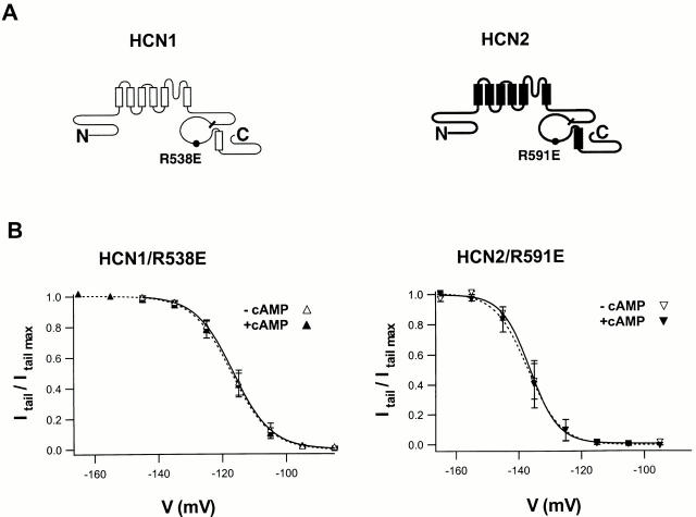 Figure 7. Mutation of a conserved arginine residue in the CNBD to glutamate prevents cAMP binding, but has no effect on the channel's intrinsic voltage dependence. (A) Diagram showing the site of the mutation. HCN1 and HCN2 are shown as six transmembrane helices (rectangles) with the P-loop connecting the fifth and sixth helices. The CNBD, located in the cytoplasmic COOH terminus, starts at the hash mark and ends at the last rectangle. It is depicted as a loop, representing the β-roll, and a rectangle, representing the C α-helix. (B) Steady-state tail current activation curves obtained in inside-out patches using 3-s hyperpolarizing steps for HCN1/R538E (left) and HCN2/R591E (right) channels. (open symbols) Data in absence of cAMP. (closed symbols) Data in presence of 10 μM cAMP. Solid and dashed curves show fits of Boltzmann relation in absence and presence of cAMP, respectively (see Table for values).