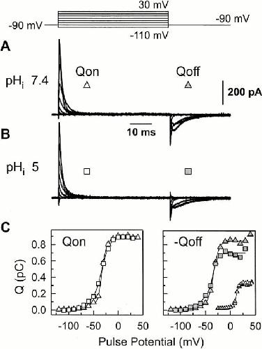 Figure 3. Gating charge displacement in the R377H channel is unaffected by internal protons. (A) Gating current records from the R377H channel measured from an inside-out macropatch in symmetric NMDG-MS pH 7.4 solutions. The superimposed currents are in response to various test pulses from a holding potential of −90 mV, also shown superimposed at the top. Onset of the test pulse stimulates an ON-gating current (Qon), and repolarization of the membrane causes the returning OFF-gating current (Qoff). (B) The same sequence of superimposed gating current records from the same macropatch after exchange of the pH 7.4 internal solution (pHi 7.4) with a pHi 5 internal solution. (C) ON- and OFF- gating currents were each integrated over time and plotted as a function of pulse potential to obtain the voltage dependence of steady-state charge displacement (Q-V curves). Q-V curves are shown for the ON- (left panel, open symbols) and OFF-gating currents (right panel, closed symbols) displayed in A (pHi 7.4, triangles) and B (pHi 5, squares). The ON and OFF Q-V curves for the gating currents measured in symmetric pH 7.4 solutions are plotted on the same graph in the inset of the right panel. Each Q-V curve was fit to a sum of two Boltzmann distributions (lines). (Experiment D03238a) |