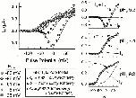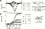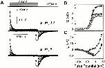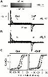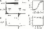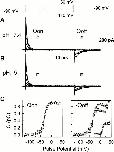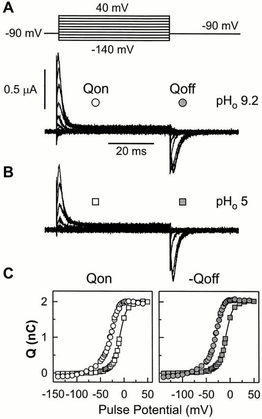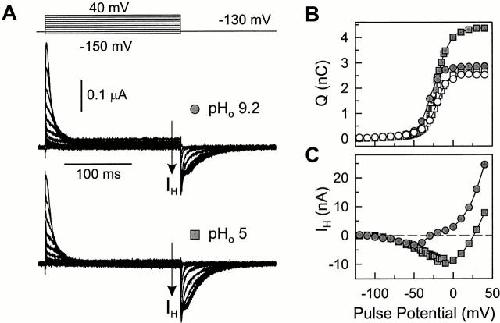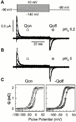 Figure 12. Gating currents of the E283Q/R371H channel. (A) Using the cut-open oocyte voltage clamp, E283Q/R371H channel gating currents were measured in symmetric NMDG-MS solutions with internal pH 9.2, and either pHo 9.2 (top currents) or pHo 5 (bottom currents). All gating currents were recorded from the same membrane area. The gating currents in each pHo group (shown superimposed) were elicited by the pulse protocol series shown at the top. (B) Q-V curves for the ON- (open symbols) and OFF-gating currents (closed symbols) displayed in A (pHo 9.2, circles; pHo 5, squares). (C) The voltage dependence of steady-state ON-gating currents shown in A (circles, pHo 9.2; squares, pHo 5). The linear leak component has already been subtracted out, as described in materials and methods (Data Analysis of I-V Curves). (Experiment D11037a) |