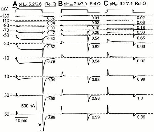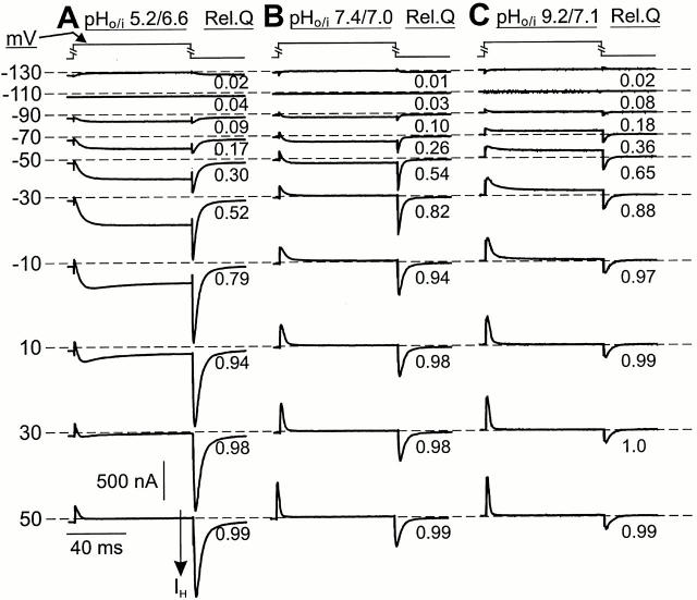 Figure 7. Gating currents of the R368H channel displace titrateable charge and transport protons. Using the cut-open oocyte voltage clamp, R368H channel gating currents were recorded in internal HB solution, pH 7.4, and various external HB solutions (A, pHo 5.2; B, pHo 7.4; C, pHo 9.2). The intracellular pH (pHi) was measured with a H+-sensitive electrode. All gating currents were recorded from the same membrane area. The gating currents in each pHo group were elicited by a family of test pulses (in millivolts) from a pre- and postpotential pulse of −110 mV (represented at the top of each group). The test pulse value corresponding to each current is shown on the left. The normalized charge displacement in each gating current (Rel. Q, shown to the right of each trace) was obtained by integrating the OFF-gating currents (Fig. 9 B) and normalizing to the maximum value of each pHo group. Linear leak current was subtracted from each current trace off-line as described in materials and methods (Data Analysis of I-V Curves). (Experiment D11200a) |