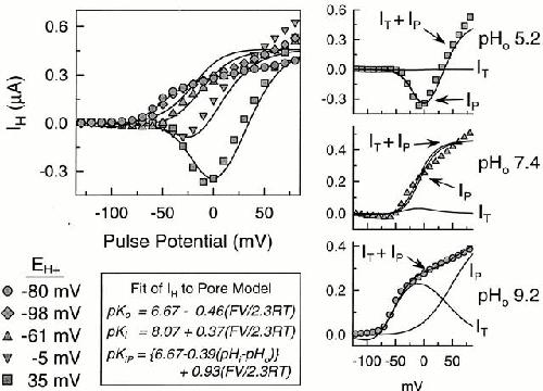 Figure 11. Proton transport and conduction by the R371H channel voltage sensor. I-V plots of the steady-state proton currents, IH, measured in five different pH gradients: pHo/pHi 9.2/7.8 (•), pHo/pHi 8.3/6.6 (♦), pHo/pHi 7.4/6.34 (▴), pHo/pHi 6.3/6.2 (▾), and pHo/pHi 5.2/5.8 (▪). The Nernst equilibrium potential established by each pH gradient, EH+, is also displayed. Gating currents and pHi were measured simultaneously as described and shown for three of the gradients in Fig. 10. All five proton current I-V curves were simultaneously fit to an expression for proton current values (see theory, ) predicted from a model of a titrateable voltage sensor that forms a proton pore upon depolarization. The proton current predicted by the model is the sum of a proton transport current, IT, and a proton pore current, IP. The parameters of the best fit to the model (shown as lines) are: pKo(0) = 6.67, pKi(0) = 8.07, δo = 0.460, δi = 0.373, δip = 0.934, γo = 93.5/s, ɛo(0) = 4.33e8/(M s), γip = 138/s, N = 3.08e10, z = 1.14, z1 = 0.844, δα1 = 0.139, δα2 = 0.879, α1(0) = 7247/s, α2(0) = 818/s, and β1(0) = 2,369/s. (Experiment D11210b) |