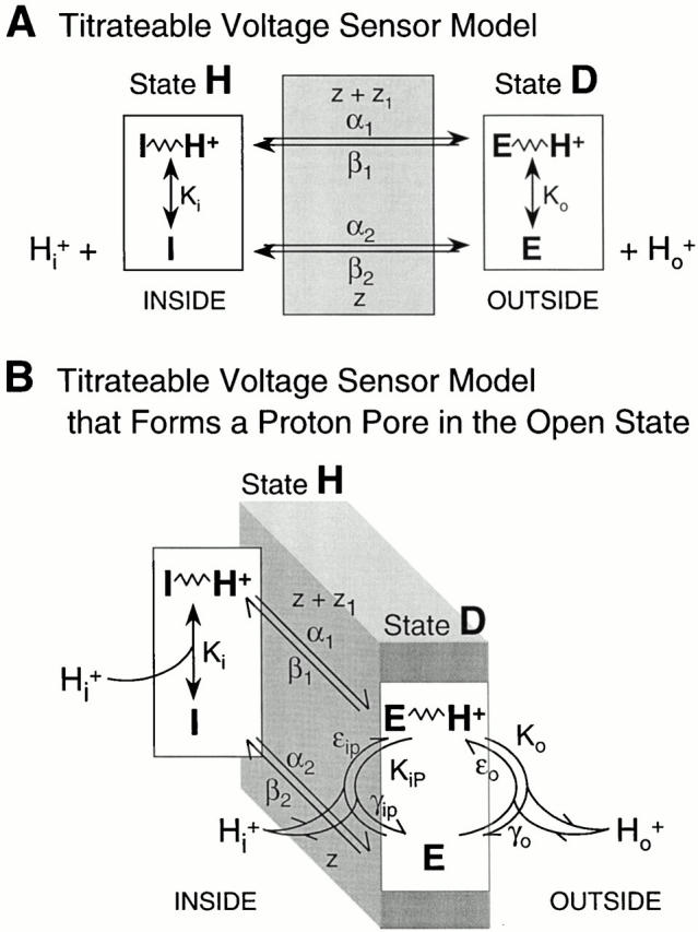 Figure 1. Titrateable voltage sensor models. (A) Gating currents were modeled as transitions between H and D connected by voltage-dependent rate constants α and β. The charge carried by the titrateable voltage sensor in each transition between H and D is either z or z + z1, as determined by the equilibrium dissociation constant, pK (Ki or Ko), of the titrateable group and the surrounding pH (Hi+ or Ho+ if the titrateable group gets exposed to the internal or external solution, respectively). Since the S4 segment, which contains most of the voltage sensing residues, is positively charged, depolarization of the membrane (gray box) moves the voltage sensor from the inside of the membrane towards the outside, thereby moving charge z or z + z1, in the transition. (B) The titrateable voltage sensor model shown in A was extended to incorporate the formation of a one-ion proton pore at depolarized potentials. In the D states, the titrateable residue has access to both the internal and external solutions simultaneously, and this creates a proton pathway through the membrane. Proton binding in the D states from the external solution depends on the dissociation constant, pKo (Ko = γo/Éo) and the external pH (Ho); binding from the internal solution depends on pKiP (KiP = γip/Éip) and pHi. |