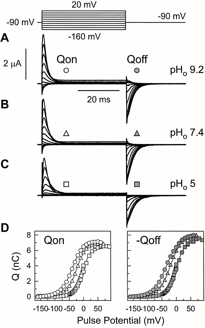 Figure 6. Gating charge displacement in the K374H channel is unaffected by external protons. (A) Gating current records from the K374H channel measured in the cut-open oocyte configuration in symmetric NMDG-MS pH 9.2 solutions (pHi 9.2 and pHo 9.2). The superimposed currents are in response to various test pulses from a holding potential of −90 mV, also shown superimposed at the top. (B) The same sequence of superimposed gating current records from the same oocyte in pHo 7.4 external solution. (C) The same sequence of superimposed gating current records from the same oocyte in pHo 5 external solution. (D) Q-V curves for the ON- (left panel, open symbols) and OFF-gating currents (right panel, closed symbols) displayed in A (pHo 9.2, circles), B (pHo 7.4, triangles), and C (pHo 5, squares). (Experiment D06088a) |