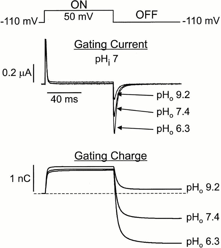 Figure 8. Titration of gating charge displacement in the R368H channel. The gating currents in response to a 50-mV test pulse, were recorded in three pH gradients from the same oocyte described in Fig. 7. The current records are shown here superimposed along with the corresponding gating charge displacement obtained by integrating the gating currents over the duration of the ON and OFF potential pulses. (Experiment D11200a) |