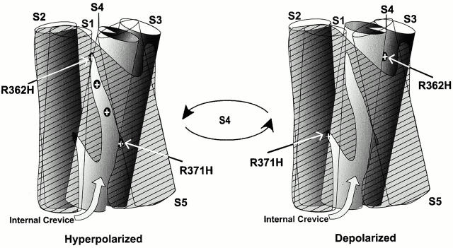 Figure 13. A model of voltage sensor operation. A model illustrating the movement of the Shaker K+ channel S4 segment from a hyperpolarized position (left) to a depolarized position (right). Only five transmembrane segments (S1–S5) of one subunit are shown for clarity. The hydrophobic region surrounding the internal crevice is represented as a hatched cloud shaped by the membrane and the sides of S1 and S5 facing each other. Depolarization causes a rotation of the S4 segment and movement of the first four S4 charges from the internal crevice to an externally facing crevice. The external crevice cannot be seen; it faces the back between the S2 and S3 segments. |