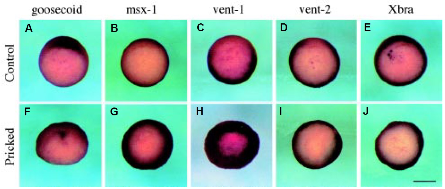 cytoplasm-depleted embryos at the early gastrula stage (stage 10+). In treated embryos, the expression level of a dorsal marker (goosecoid) was