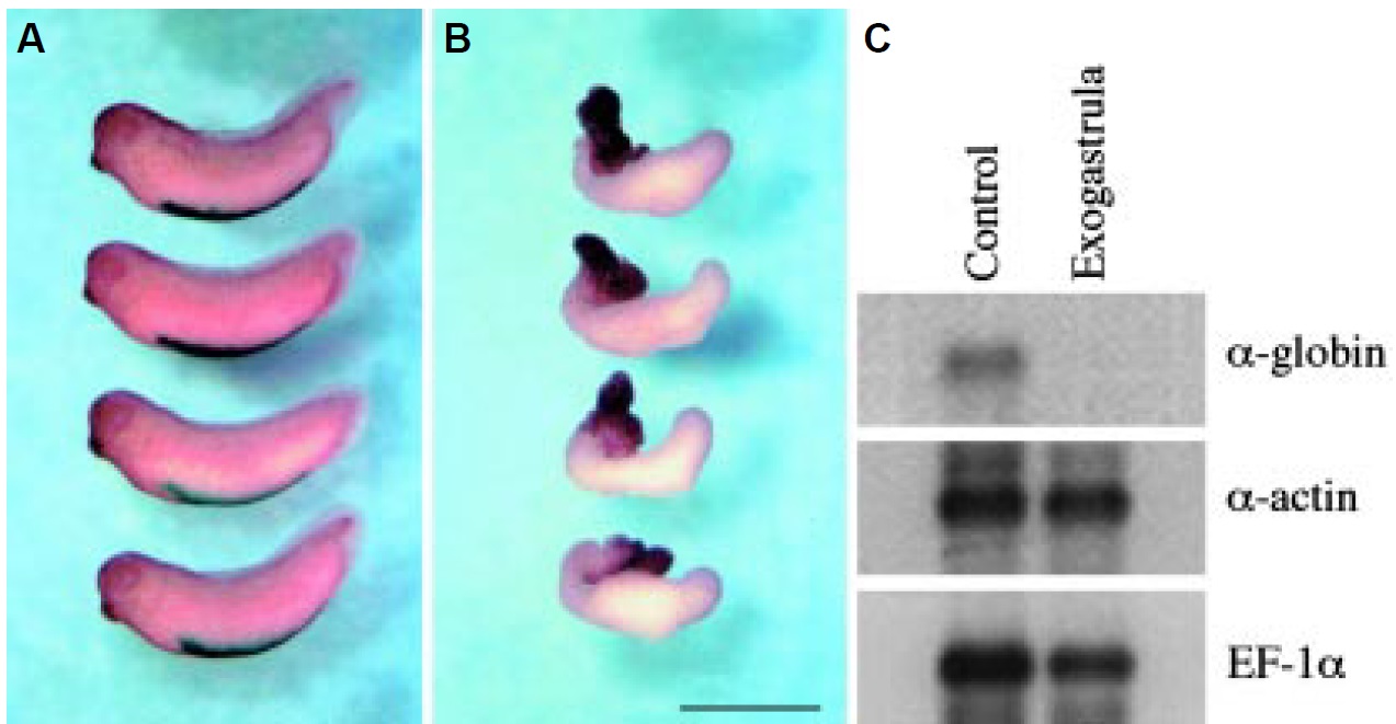 globin. In exogastrula embryos (B), no expression of a-globin was observed. Scale bar in B indicates 2 mm. In addition, the expression of a-actin was