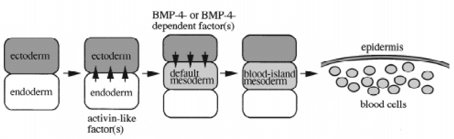 the overlaying ectoderm to differentiate into blood cells. This factor(s) is thought to be BMP-4 itself or a secretory factor(s) activated by the BMP-4 signaling