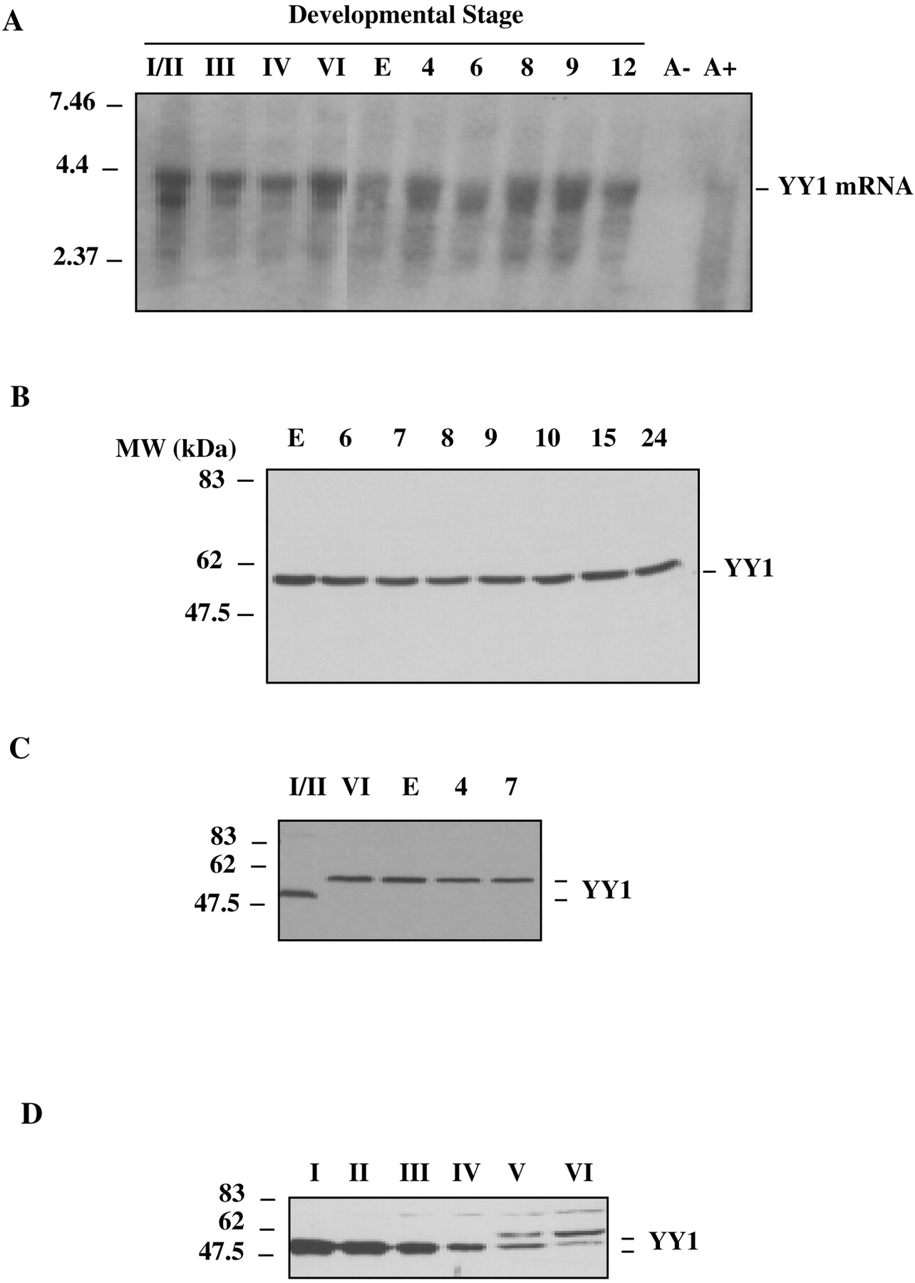 ???displayArticle.abstract??? Yin Yang 1 (YY1) is a multifunctional transcription factor that acts as an activator, repressor, or initiator of transcription of numerous cellular and viral genes. Previous studies in tissue culture model systems suggest YY1 plays a role in development and differentiation in multiple cell types, but the biological role of YY1 in vertebrate oocytes and embryos is not well understood. Here we analyzed expression, activity, and subcellular localization profiles of YY1 during Xenopus laevis development. Abundant levels of YY1 mRNA and protein were detected in early stage oocytes and in all subsequent stages of oocyte and embryonic development through to swimming larval stages. The DNA binding activity of YY1 was detected only in early oocytes (stages I and II) and in embryos after the midblastula transition (MBT), which suggested that its potential to modulate gene expression may be specifically repressed in the intervening period of development. Experiments to determine transcriptional activity showed that addition of YY1 recognition sites upstream of the thymidine kinase promoter had no stimulatory or repressive effect on basal transcription in oocytes and post-MBT embryos. Although the apparent transcriptional inactivity of YY1 in oocytes could be explained by the absence of DNA binding activity at this stage of development, the lack of transcriptional activity in post-MBT embryos was not expected given the ability of YY1 to bind its recognition elements. Subsequent Western blot and immunocytochemical analyses showed that YY1 is localized in the cytoplasm in oocytes and in cells of developing embryos well past the MBT. These findings suggest a novel mode of YY1 regulation during early development in which the potential transcriptional function of the maternally expressed factor is repressed by cytoplasmic localization.