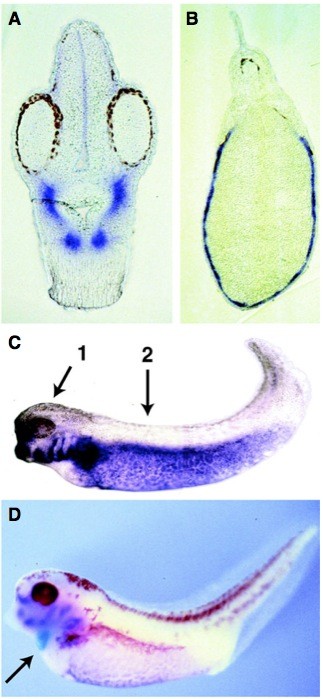 Fig. 4. Expression of XFD-13FoxF1b) during Xenopus development. (A) Transverse section through the head of a stage 35 embryo hybridized with an XFD-13FoxF1b) probe. Expression is in the neural crest cells. The plane of section is indicated in the Fig. 4C (number 1). (B) Transverse section through the trunk of a stage 35 embryo hybridized with an XFD- 13FoxF1b) probe. Expression is in the lateral and ventral regions of the embryo. The plain of section is indicated in the Fig. 4C (number 2). (C) Whole mount in situ hybridization of a stage 35 embryo with the XFD- 13FoxF1b) probe. Numbers indicate the plane of section in Figs. 4 A,B. (D) Whole mount in situ hybridization of a stage 40 embryo with XFD- 13FoxF1b) and troponin probes. Light pink staining indicates XFD- 13FoxF1b) expression, whereas the blue staining indicates troponin expression in the heart. An arrow indicates this area of expression. There is no XFD-13FoxF1b) expression in the heart.