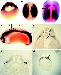 Fig. 1. Expression of three different forkhead genes during early Xenopus development. (A) In situ hybridization of XFKH1(FoxA4b) to a stage 12 Xenopus embryo (dorsal view). Expression is in the notochord (arrow). (B) In situ hybridization of XFKH7 to a stage 12 Xenopus embryo (dorsal view). Expression is in the presomitic mesoderm, and is absent in the notochord (arrow). (C) Transverse section of a stage 15 embryo hybridized with XFKH1(FoxA4b). Expression is in the notochord and neural floor plate. (D) Expression of XFKH7 in the trunk section of the stage 14 embryo. Expression is in the presomitic mesoderm, but it is absent in the notochord and the neural floor plate. (E) Expression of the XFD-13FoxF1b) in the trunk section of stage 15 embryo. Expression is in the lateral plate mesoderm. No expression is visible in the notochord and presomitic mesoderm. Expression is also absent in the most ventralmesoderm.