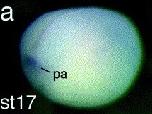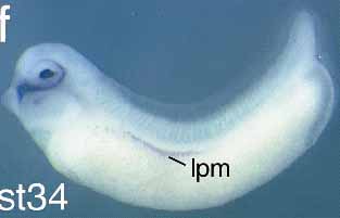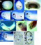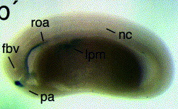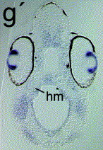 Fig. 2. Expression of Xpitx3 during Xenopus development. Whole-mount in situ hybridization was performed using Xpitx3 antisense RNA and staged Xenopus embryos. NieuwkoopâFaber stages of embryogenesis are indicated. (a,bâ²,c,d,e,f,fâ²,g) Lateral view; (b) anterior view of the embryo; to improve resolution cleared embryos in lateral view are shown in (bâ²,fâ²,fâ²). (gâ²,gâ²) show frontal sections of the embryo shown in (g). In (fâ²) the embryo of (f) is shown in an anterior view. ale, anterior lens epithel; fbv, forebrain ventricle; ec, eye cup; fe, foregut endoderm; gl, ganglion layer; hm, head mesenchyme; il, inner layer; inl, inner nuclear layer; lp, lens placode; lpm, lateral plate mesoderm; lv, lens vesicle; nc, notochord; pa, pituitary Anlage; pt, pituitary; rpe, retinal pigment epithel; pfl, primary lens fibres; roa, roof of archenteron. |