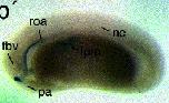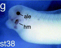pitx3 (paired-like homeodomain 3) gene expression in Xenopus laevis embryo, assayed via in situ hybridization, NF stage 17, lateral view, anterior left, dorsal up. |