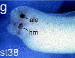 pitx3 (paired-like homeodomain 3)gene expression in Xenopus laevis embryo, assayed via in situ hybridization, NF stage 21, anterior view, dorsal up. |