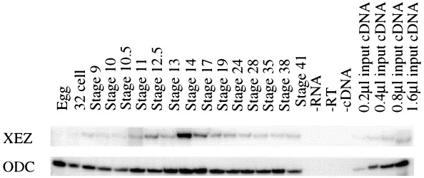Fig. 2. Temporal expression profile of XEZ. RT-PCR showing expression pattern of XEZ transcripts in Xenopus laevis unfertilised egg and embryo stages. Significant maternal expression is not detected. Zygotic expression of XEZ commences at low levels in the late blastula stages, increasing at mid to late gastrula stages, peaking in the early neurula stages and is still detectable at stage 41. Stage 41 cDNA is used for the linearity control and ODC is used as a loading control.