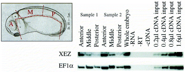 Fig. 4. XEZ expression is anteriorly restricted. Dissection series of stage 25 Xenopus laevis embryos analysed by RT-PCR. Stage 25 embryos were dissected as shown in the insert picture into three equivalent axial pieces, A, anterior; M, middle; P, posterior; the endoderm was removed. Duplicate samples 1 and 2 both consisted of 5 embryos. Analysis shows the expression of XEZ is highest in the anterior nervous system, is reduced in the middle section and is barely detectable in the posterior in both dissected embryo pools. Whole embryo control cDNA at stage 25 was used for the linearity and EF1α was used as a loading control. Since the sections of neural tissue were equal in terms of regional identity, but only approximately equivalent in terms of amount of biological material, it is not reasonable to equalize loading of cDNA between samples (as shown by the EF1α signal).