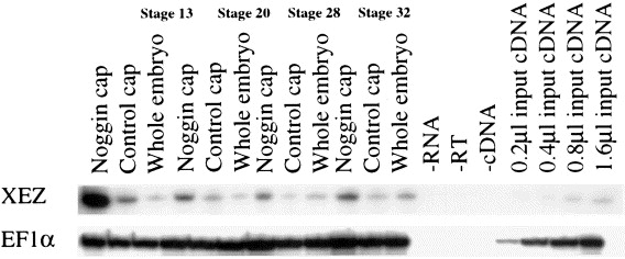 Fig. 5. XEZ is induced by noggin. RT-PCR showing induction of XEZ in noggin-injected animal caps. Animal caps were taken from stage 9 embryos previously injected at the 1 cell stage with noggin mRNA. The animal caps were cultured to stage 13, 20, 28 and 32. RT-PCR analysis shows that at stage 13 XEZ expression is highly induced in noggin animal caps compared to a much lower level of expression in control animal caps. However, this high level of expression is not maintained and XEZ expression is only slightly higher in animal caps overexpressing noggin compared to control caps at stages 20, 28 and 32. Stage 32 whole embryo cDNA was used as input for the linearity and EF1α was used as a loading control.