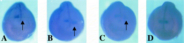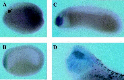 Fig. 3. Wholemount in situ hybridisation of XEZ. Wholemount in situ hybridisation of XEZ DIG labelled antisense RNA probe shows that expression of XEZ is restricted to the anterior nervous system. (A) Stage 14 embryo expression is restricted to the anterior nervous system (indicated by arrow) (B) Stage 20 embryo and (C) Stage 27 embryo, the XEZ transcripts are detected in the anterior nervous system. In (B) and (C) the expression pattern appears to be graded with the strongest expression in the most anterior regions. (D) Stage 35 embryo shows that expression of XEZ later becomes restricted to the forebrain, eye and branchial arches. The XEZ expression is highest in the first branchial arch, less in the second and is greatly reduced in the third and fourth arches. The sense probe control showed no staining pattern (data not shown).