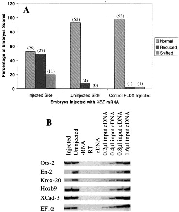 Fig. 8. XEZrepresses En-2. (A) Xenopus laevis embryos were uni-laterally co-injected at the 2-cell stage with XEZmRNA and FLDX. The embryos were cultured to stage 19 and subjected to wholemount in situ hybridisation using the midbrain-hindbrain junction marker En-2 antisense RNA probe. The embryos were scored as having reduced expression of En-2when the level of En-2 staining was lower (or absent) than control embryo normal variation. The embryos showing reduced-expression were also scored for any shift in the anterior or posterior register of the En-2 marker staining relative to the uninjected side. Numbers in brackets are actual numerical scores. (B) XEZ represses En-2, Krox-20 but not other neural markers. Embryos were injected at the 1 cell stage with XEZmRNA, cultured to stage 19 and subjected to RT-PCR. The figure shows that the expression of En-2 and Krox-20 are repressed compared to uninjected control, but other neural markers are not affected. EF1α was used as a loading control and the uninjected sample used for linearity input cDNA.