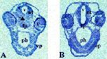 Fig. 6. Overexpression of XEZ results in thickening of the floor plate region in the forebrain of in Xenopus laevis embryos. Embryos were injected with XEZ mRNA and cultured to stage 37. The embryos were then wax embedded, sectioned at 6 μm and stained with eosin and hematoxylin. (A) Section shows thickening of the floor of the midbrain (arrow) compared to (B) a normal control embryo. v, ventricle; nt, neural tube; fp, floor plate; ph, pharynx; ep, epidermis; e, eye.