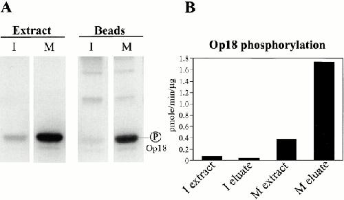 Figure 4. Chromatin-associated proteins phosphorylate recombinant Op18 in vitro. (A) Autoradiogram of recombinant Op18 showing [γ32P]phosphate incorporation after incubation with interphase or mitotic extract, or chromatin beads isolated from interphase or mitotic extract. (B) Quantification of in vitro Op18 kinase data comparing total extract (I, M extract) and 0.5 M KCl-eluted chromatin proteins (I, M eluate).