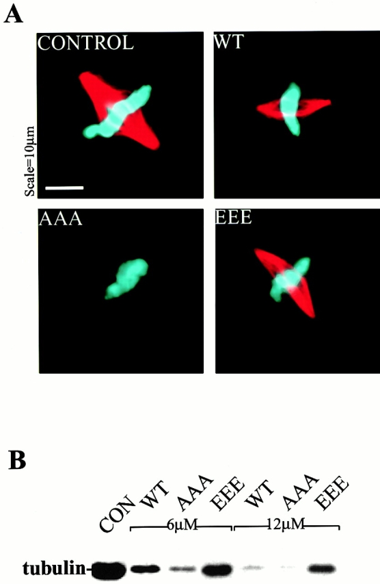 Figure 1. Differential effects of phosphorylation site mutants of Op18 on spindle assembly reactions in Xenopus egg extracts. (A) Effects of 6 μM Op18-WT, AAA (all three Serine phosphorylation sites mutated to Alanine) or EEE (all three Serine phosphorylation sites mutated to Glutamic acid) on spindle assembly in Xenopus egg extracts. Microtubules appear red and sperm chromosomes blue. (B) Biochemical quantification of depolymerizing activities shown by antitubulin immunoblot of microtubules pelleted from extracts in the presence of 6 or 12 μM Op18-WT, -AAA, and -EEE. The control (CON) is buffer addition in both A and B.