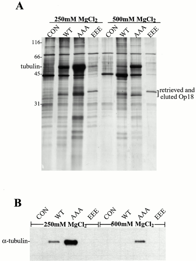 Figure 2. Nonphosphorylatable Op18 binds tightly to tubulin in extracts. (A) Silver-stained gel of MgCl2 elutions of control, ZZ-WT, -AAA, and -EEE Op18 bound to IgG Sepharose retrieved from extracts. (B) The elutions from A were blotted for α tubulin. The control (CON) is buffer addition in both A and B.